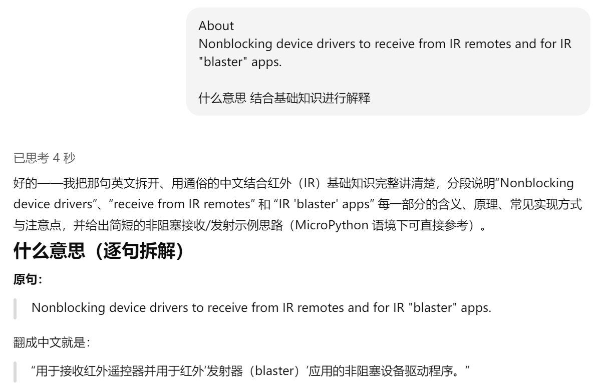 第三课 如何使用 AI 工具辅助快速阅读陌生代码 摘要: 本文以MicroPython红外传感器驱动为例,3步搞定代码阅读,快速上手新模块开发。 对于新手而言,首次阅读陌生代码比较困难,看不懂写的是什么、如何进行测试?都是常见的问题。 接 ...