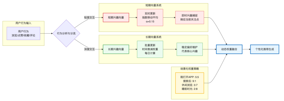 作者:Gundy 1. 场景与目标 UGC 社区典型特点:内容量大、更新快、长尾重。推荐系统要同时兼顾“眼下的即时兴趣”和“用户的稳定偏好”,并在一次请求内完成多路候选召回与融合,保证毫秒级延迟。 本文给出一套双向量用户兴趣 + 一次 SQ ...