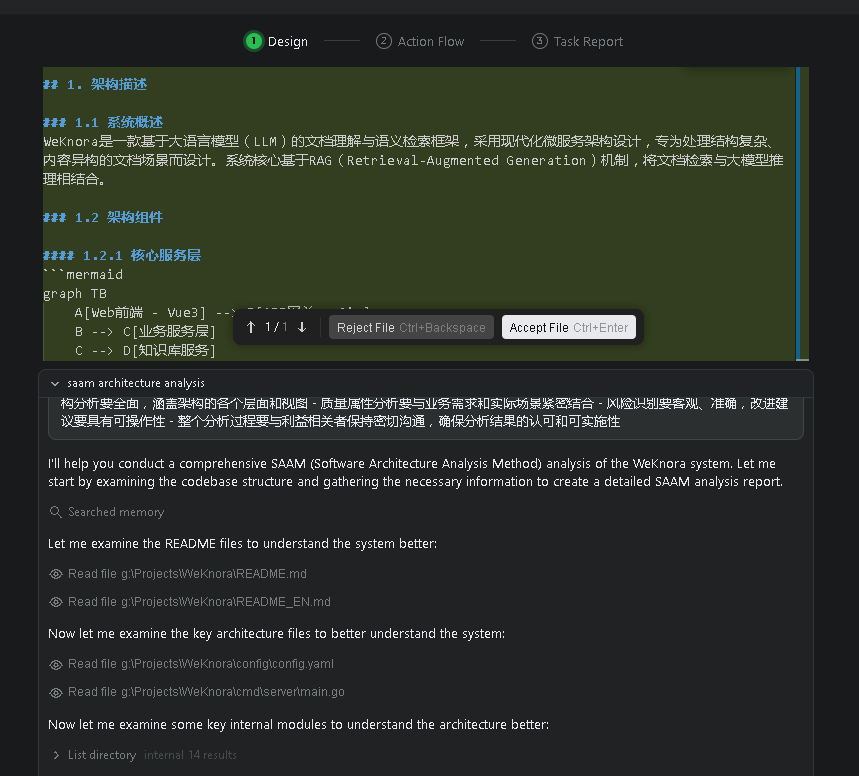 背景 我们使用SAAM提示词,来自《基于AI互联网系统架构分析与评估》 规划输出文档 我们使用Auto模式,默认没有选模型 2次迭代更新报告后,点击start now,根据架构改进建议,开始写代码 自动生成行动清单,灰色是已经完 ...