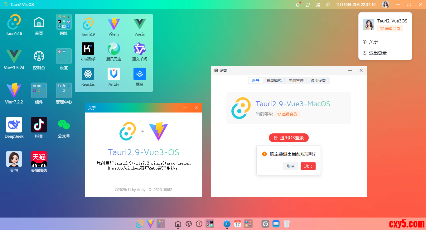 最新版tauri2.9+vite7.2+pinia3+arco仿macOS/wins管理系统TauriVue3OS。 vite7-tauri2-os基于最新跨平台框架tauri2.9+vite7.2.2+vue3 setup+pinia3+arco-design+echarts实战桌面客户端OS管理后台模板。内置macOS+windows两种桌面模板、可 ...