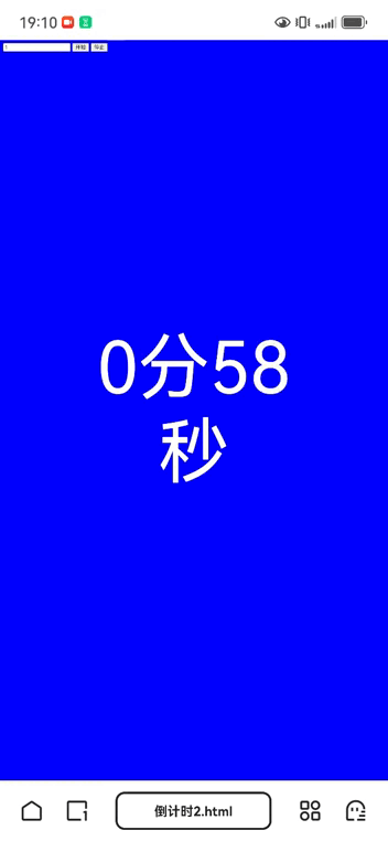 一、解构 如图所示,手机浏览器的效果。代码就是简单的html语言加上一个JavaScript脚本,界面主要分3部分,功能实现主要分3个函数。 (一)显示样式 在头里定义了居中显示的CSS样式,将来在浏览器中居中显示倒计时X分XX秒。 (三)倒 ...