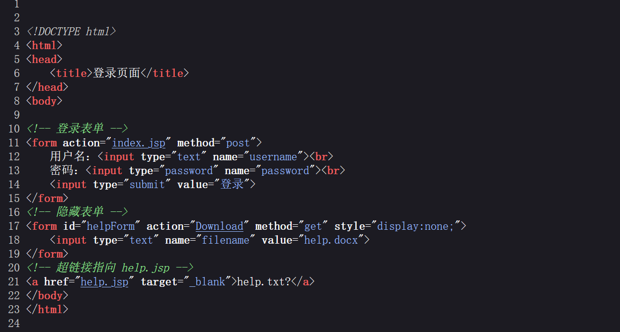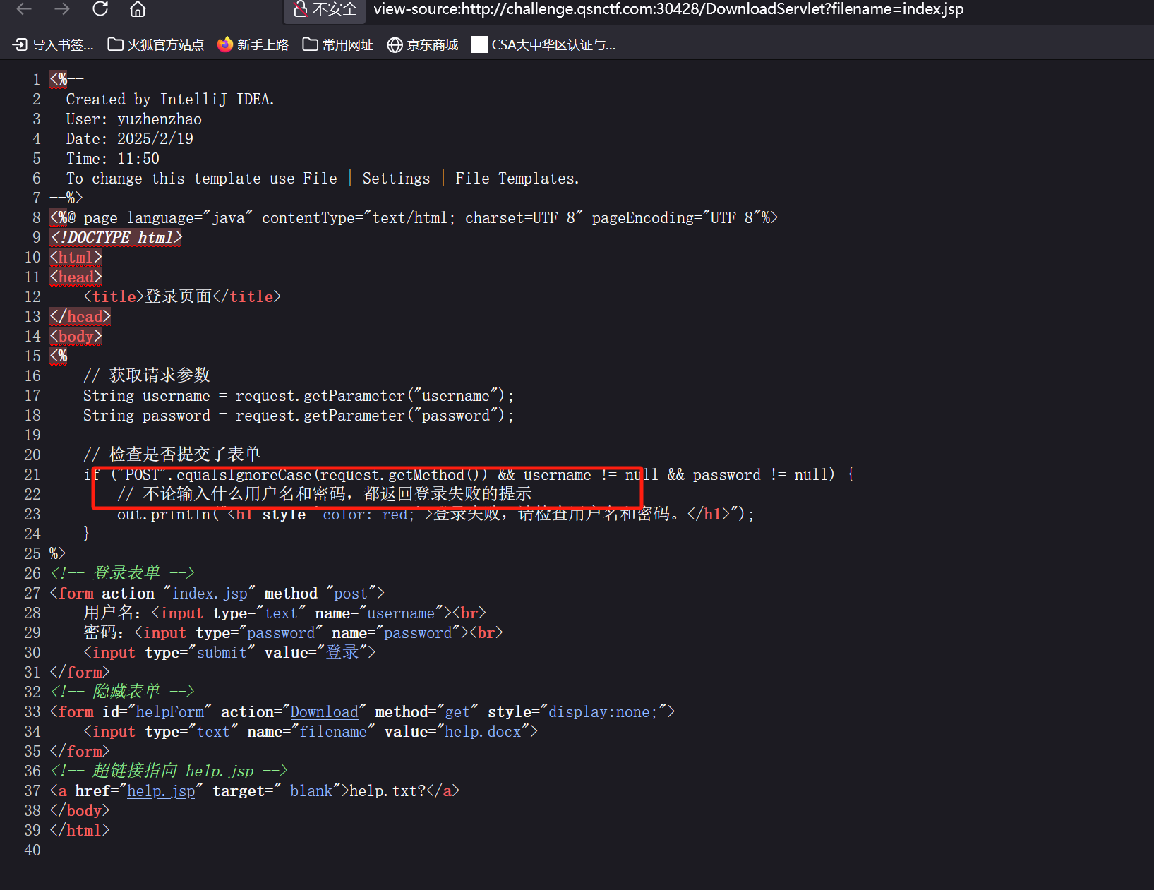 File_download 根据源码可以知道这有个隐藏表单,提示我们存在下载 根据help.jsp的get or post filename to /DownloadServlet ?,要求我们去传参一个filename 我们先去读一读index.jsp 可以明显知道这个登录界面是个幌子,这题的突破 ...