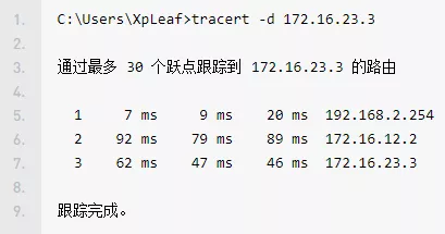 在上面的网络环境中,在网络通的情况下,我们在电脑上使用命令tracert -d命令,会得到下面的结果: