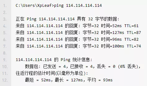 这里采取的是直接ping公网地址的方法,是为了排除DNS的影响(万一你的DNS设置又有问题),至于要ping什么样的公网地址,个人建议是,可以ping一些没有禁止ping的公共DNS服务器地址,比如114.114.114.114和8.8.8.8的: