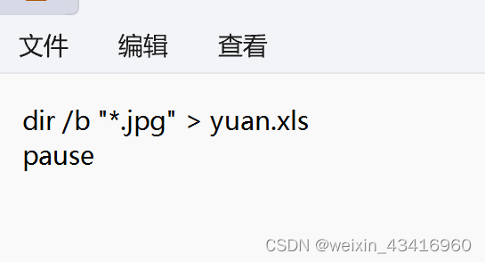 dir /b ".jpg” > 原来的文件名.txt —我这里把新生成的文件名和文件类型都改了。但是jpg不能改,因为我的文件就是jpg格式的,改了就找不到了哈。
