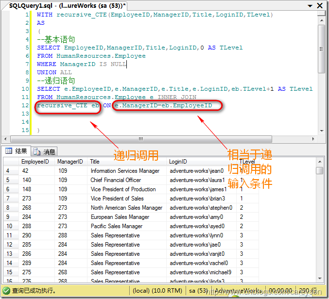 对于递归公用表达式来说,实现原理也是相同的,同样需要在语句中定义两部分: