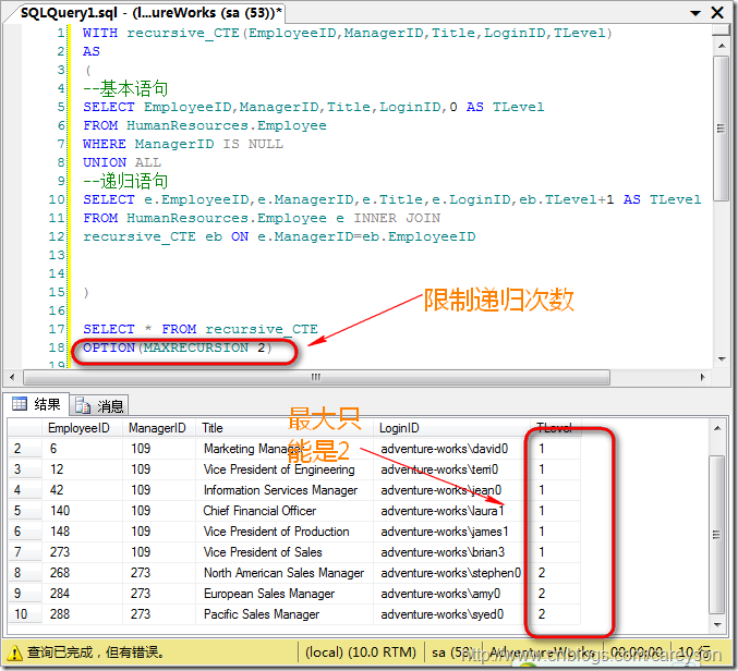 当然,越强大的力量,就需要被约束.如果使用不当的话,递归CTE可能会出现无限递归。从而大量消耗SQL Server的服务器资源.因此,SQL Server提供了OPTION选项,可以设定最大的递归次数: