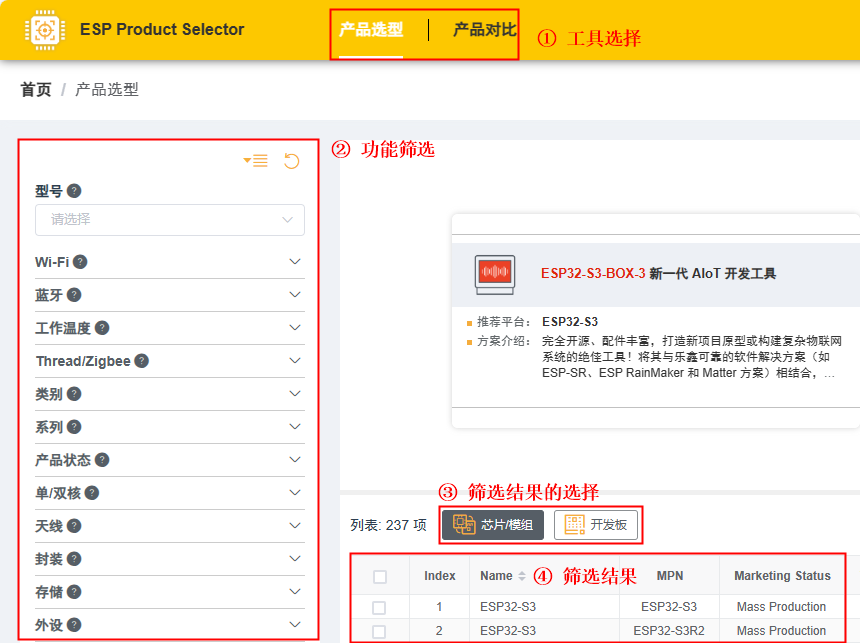 上图①显示了筛选工具的选择,左边是产品选型,右边是产品对比。上图②表示产品选型的功能筛选,主要根据客户的需求来选择,例如工作温度、单/双核、是否具备天线等条件,来选择自己心仪的芯片/模组或者开发板。上图③表示功能筛选之后的结果选择,例如芯片/模组或者满足条件的开发板。最后,上图④表示筛选的结果,如果筛选结果是芯片/模组,那么它就会显示符合筛选的芯片型号或者模组。