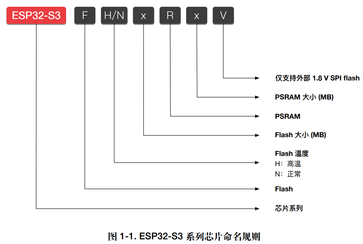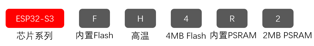 乐鑫S3系列型号包括ESP32-S3、ESP32-S3R2、ESP32-S3R8和ESP32-S3FN8等。这些型号在硬件配置、功能和应用场景方面略有不同。不同型号的MCU都有不同的应用场景,下面我们来看一下这些型号的命名规则,如下图所示。