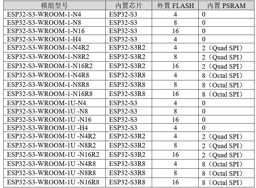 从上图可知,ESP32-S3-WROOM-1采用PCB板载天线,而ESP32-S3-WROOM-1U采用连接器连接外部天线。两款模组均有多种芯片型号可供选择,具体见下表所示: