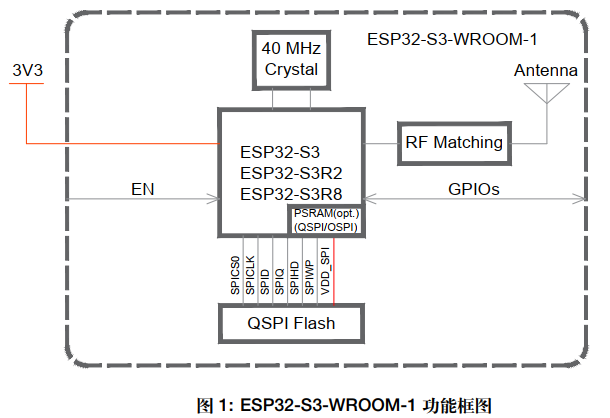 图3.4.3 ESP32-S3-WROOM-1和ESP32-S3-WROOM-1U的功能框图