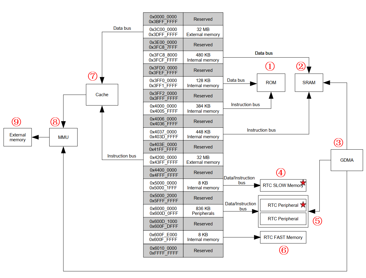 上图中,灰色背景的地址空间不可用,红色五角星表示对应存储器和外设可以被协调器访问。由于ESP32-S3系统是由两个哈佛结构Xtensa® LX7 CPU构成,这两个CPU能够访问的地址空间范围是完全一致的。上图中,地址0x40000000以下部分属于数据总线的地址范围;地址0x40000000~4FFFFFFF部分位指令总线的地址范围,其他是数据总线与指令总线的地址范围,即内部存储器、外部存储器和外设等映射的内存地址。