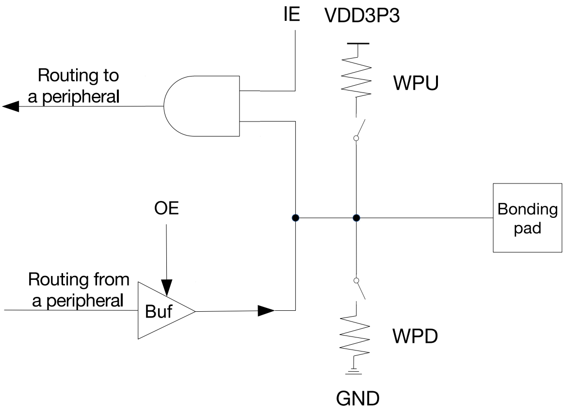 在系统启动早期阶段,GPIO3可用于控制JTAG信号源。该管脚没有内部上下拉电阻,strapping的值必须由不处于高阻抗状态的外部电路控制。如图所示,GPIO3与EFUSE_DIS_PAD_JTAG、EFUSE_DIS_USB_JTAG和EFUSE_STRAP_JTAG_SEL共同控制 JTAG 信号源。