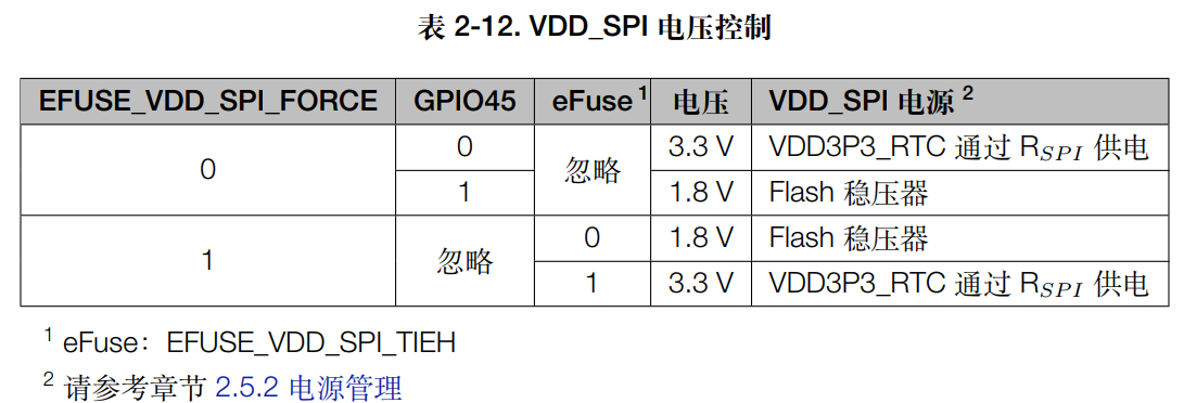 从上图可以看到,电压有两种控制方式,具体取决于EFUSE_VDD_SPI_FORCE的值。如果这个值为0,那么VDD_SPI电压取决于GPIO45的电平值。如果GPIO45的电平值为0,VDD_SPI电压为3.3V;否则为1.8V。相反,如果EFUSE_VDD_SPI_FORCE 为 1,VDD_SPI电压取决于 eFuse(表示 flash 电压调节器是否短接至VDD_RTC_IO)。如果eFuse为0,VDD_SPI电压值为1.8V;否则为 3.3V。