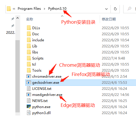 • 将下载好的浏览器驱动放置在Python安装目录下(即Python环境变量配置目录)