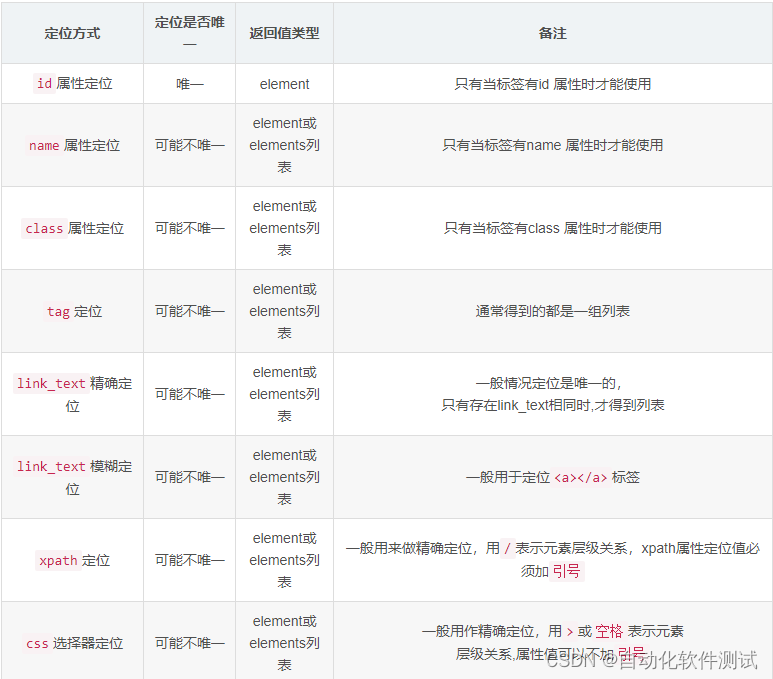 • find_element_by(By.CLASS_NAME,‘xx’)class定位,根据元素的class属性值定位,但可能受JS影响动态变化。定位到的标签不一定是唯一的。