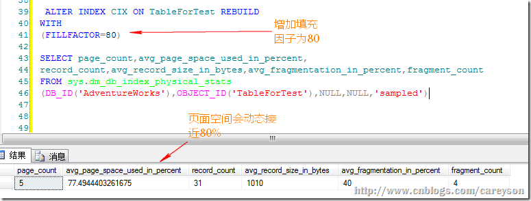 填充因子的作用正是如此。对于默认值来说,填充因子为0(0和100表示的是一个概念),则表示页面可以100%使用。所以会遇到前面update或insert时,空间不足导致分页.通过设置填充因子,可以设置页面的使用程度: