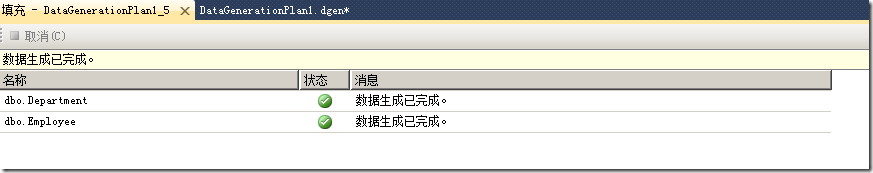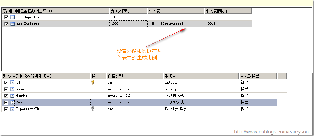 在数据生成计划中,VS2010提供的强大功能还有外键约束生成数据。上面两个表中,假设公司有1000名员工,有10个部分,对应的每生成一个部门数据则生成100个员工数据,我可以在“相关表”和“相关表设置里进行”: