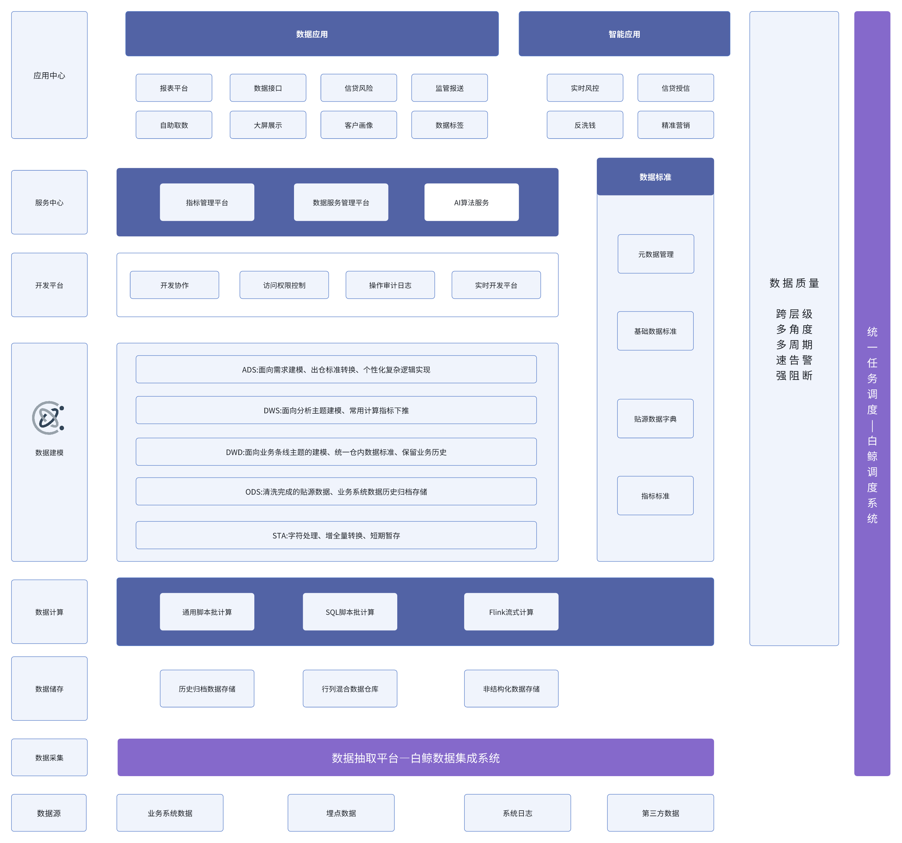 西南某城商行依托Whalestudio构建了涵盖数据开发、数据服务、数据应用和敏捷交付的完整数据服务体系,具体应用如下: