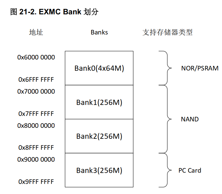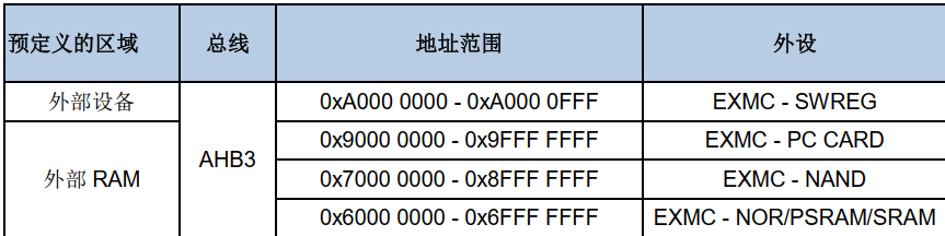 EXMC与外部地址存储器的地址映射描述如下(用户手册577页原文)