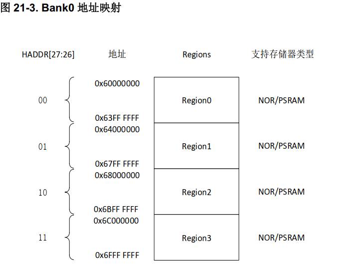 针对不同类型的外部存储器,EXMC划分了不同的地址范围用于与不同类型的外部存储器进行通信,其中分为bank和region,它们的关系如下图所示。我们代码示例中将缓冲区的起始地址重定向到0x60000000(bank0中region0的起始地址),就是为了使代码中的地址和EXMC为SRAM设置的地址范围对应。