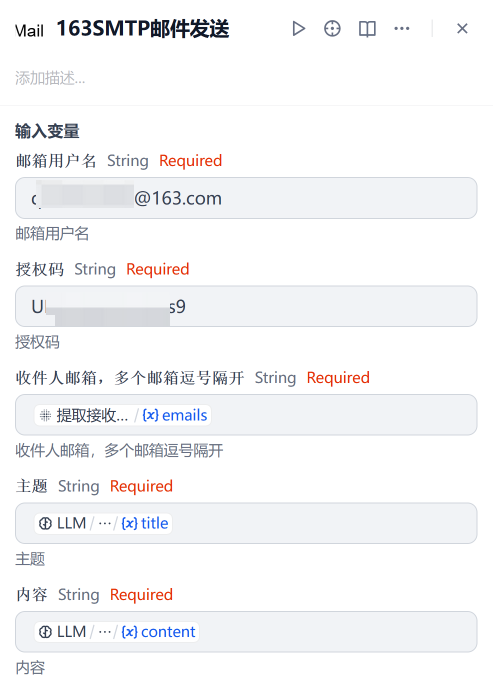 因为“电子邮件”组件需要邮件接收者为 JSON 格式,这样在发送邮件之前,我们还要进行数据格式转换操作,而这步操作对于 Dify 这种可视化平台来说实现还是比较麻烦的,尤其是对于没有代码经验的小白用户来说更麻烦,因此我们使用操作更简单 163 邮件发送组件即可(163 邮件发送组件的收件人列表为字符串即可,有多个收件人使用英文逗号隔开就行,实现很方便)。