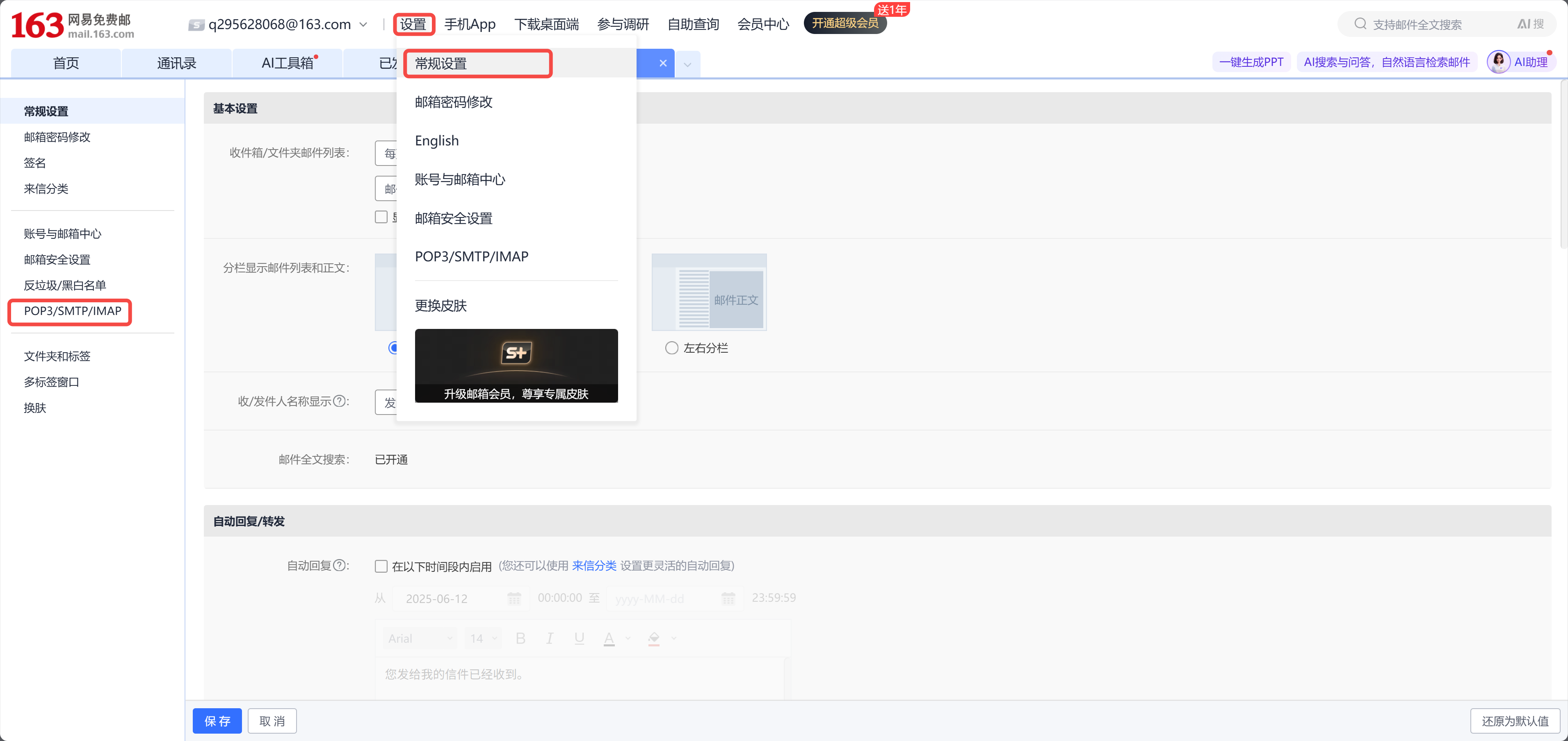我们在发送邮件之前,需要保证邮件发送者开启了 SMTP 协议才能正常通过 Dify 将邮件发送出去,它的开通方式如下:
