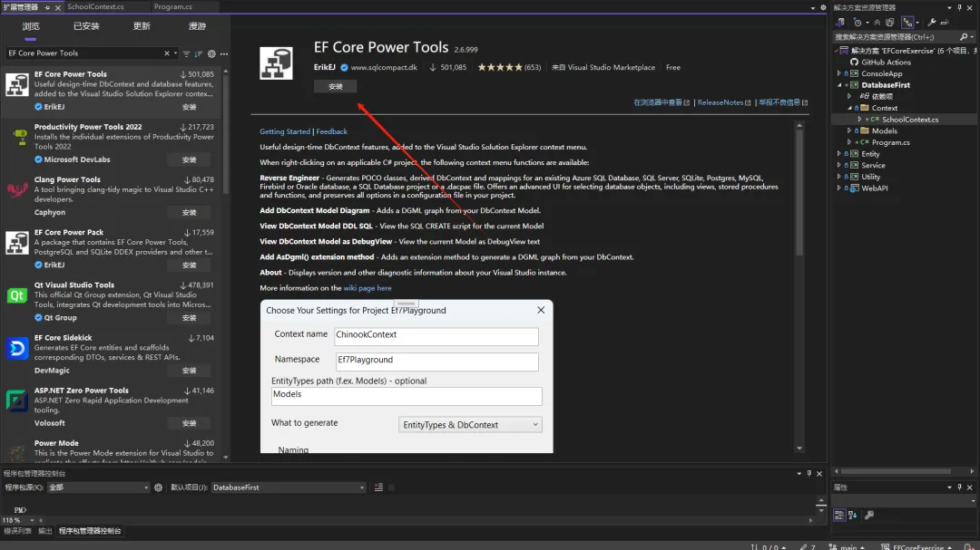 EF Core Power Tools 是一款基于 C# 编写、开源免费(MIT license)、在 EF Core 命令行工具的基础上构建的适用于 Visual Studio 2022 中的 EF Core 反向工程和模型可视化扩展插件。它提供了反向工程、迁移和模型可视化、生成关系图、生成SQL语句等功能,旨在降低使用 EF Core 的门槛,并通过图形用户界面(GUI)辅助开发者进行数据库的反向工程和DbContext模型的可视化。