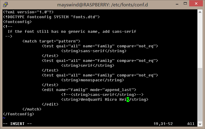 比较简单的方法是修改字体的映射,我们可以修改“/etc/fonts/conf.d/49-sansserif.conf”,将最后中的sans-serif修改为喜欢的中文字体即可,比如“WenQuanyi Micro Hei”,如下图。
