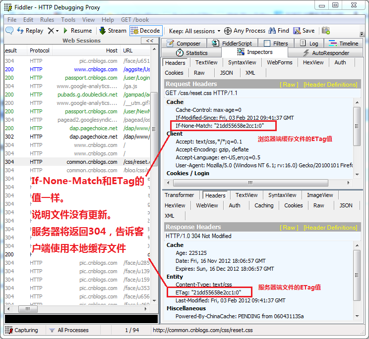 实例, 打开Fiddler, 打开博客园首页。  你可以看到很多图片,或者CSS文件都是用了缓存。 这些都是通过比较ETag的值,来判断文件是否更新了。