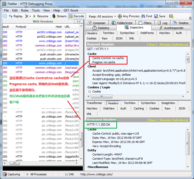 实例: 打开Fiddler, 然后打开博客园首页。然后F5刷新几次浏览器。 你会看到博客园首页也用了缓存。