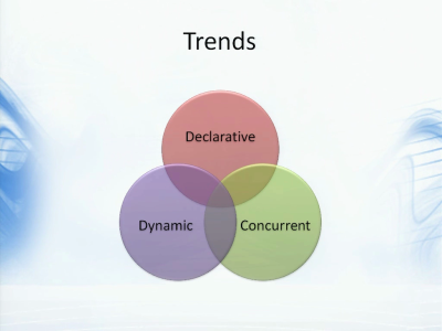 在Anders眼中,如今影响力较大的趋势主要有三种(如下图),它们分别是“声明式的编程风格”(包括“领域特定语言”及“函数式编程”)、过去的五年非常火热的“动态语言”(其最重要的方面便是“元编程”能力)以及多核环境下的“并发编程。此外随着语言的发展,原本常用的“面向对象”语言,“动态语言”或是“函数式”等边界也变得越来越模糊,例如各种主要的编程语言都受到函数式语言的影响。因此,“多范式”程序设计语言也是一个愈发明显的趋势。