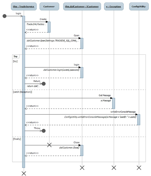 时序图的逆向工程实在太精彩了。静态的类图虽然有助于我们了解类的结构,但类之间的协作却根本无法跟踪。我们在做设计的时候,常常会借助时序图来帮助我们了解某个功能项的执行过程,追踪它的消息传递方式,清晰把握类的协作方式,并以此为基础寻找到类的行为,以及不存在于真实世界的类对象。在阅读并理解代码时,如果能够有时序图的帮助,会更容易理清设计的思路,明白设计的目的。例如,同样在StockTrader项目下,我需要了解服务层中TradeService类的login()方法实现,就可以为其生成一个时序图。在VS 2010中,生成时序图只需要在方法上点击右键,选择“Generate Sequence Diagram…”项即可。图5是为login()方法生成的时序图,我们可以清晰地看到TradeService与ICustomer和ConfigUtility之间的交互情况。
