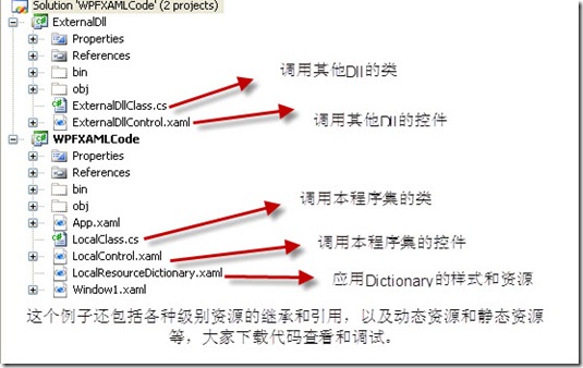 这个部分要讲的东西就太多了,由于这篇文章篇幅有限,同时我觉得用代码诠释能让大家可以更清晰地理解,所以就讲得随意一些,通过一个Demo介绍WPF对资源、类、控件的调用和处理,对Dictionary资源、Application资源、window资源以及控件资源的应用等,如下图所示(本篇所有代码在评论的第一条):