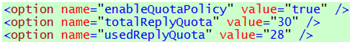 请把注意力集中在窗体的下半部分,我们看到一个CheckBox和两个TextBox,那个CheckBox是用来启用配额策略的,上面那个TextBox是只读的,它告诉用户应用程序已经发出了多少条自动回复,它的右边有个Reset按钮,可以把计数清零,下面那个TextBox则是用于设置自动回复的配额上限。这些配置信息将会存储在Options.xml里: