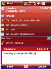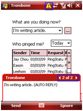 通知气球右上角的"2 of 2"旁边有两个导航按钮,分别用于向左和向右浏览等待发送的自动回复,而下面有两个菜单项,通常被称为Soft Key,分别用来发送和忽略当前显示的自动回复。默认情况下,通知气球的显示时间是10秒,在通知气球消失之后,用户可以通过屏幕最上面的通知图标重新打开通知气球。