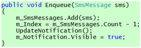 那么,这个东西怎么实现呢?首先,我得感谢Christopher Fairbairn,要不是这个家伙搞了个NotificationWithSoftKeys,恐怕今天我的日子就难过了!下载他提供的压缩包,里面只有源代码没有DLL,你可以把它们编译成DLL,然后添加到你的项目里,你也可以直接把源代码添加到你的项目里。由于NotificationWithSoftKeys里我们现在的要求还有一段距离,所以我创建了一个NotificationQueue来扩展它。NotificationQueue应用了Singleton模式,我们在它的构造函数里配置NotificationWithSoftKeys: