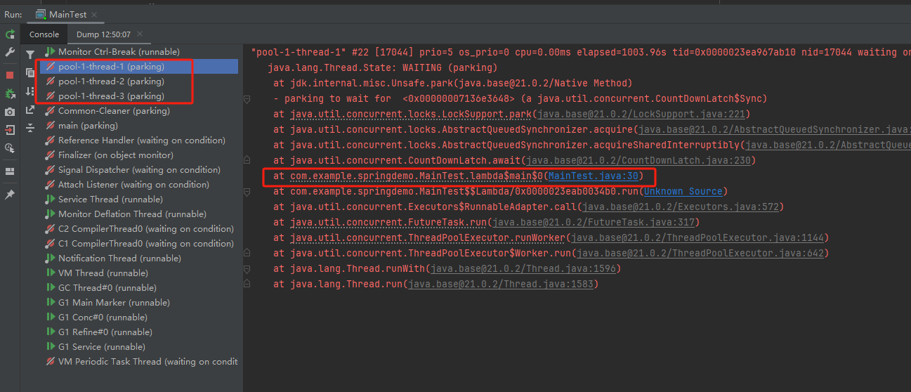 通过 Dump 文件,可以发现线程池的线程都在 MainTest 的第 30 行上 parking ,处于等待状态: