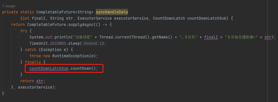 换句话说就是父任务被拦住是因为子任务的 finally 代码中的 countDownLatchSub.countDown() 方法没有被执行。