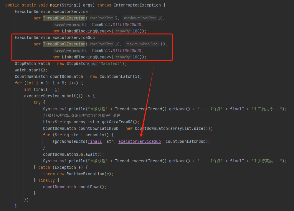 具体实现上就是给子任务再加一个 countDownLatch 栅栏: