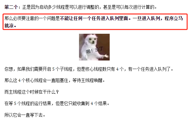 如果线程池的任务之间存在父子关系,那么请不要使用同一个线程池。如果使用了同一个线程池,可能会因为子任务进了队列,导致父任务一直等待,出现假死现象。