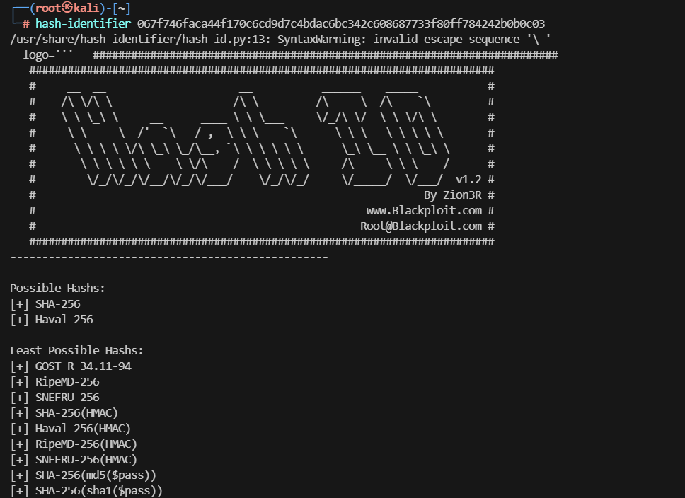 看一下是哪种类型的hash- hash-identifier 067f746faca44f170c6cd9d7c4bdac6bc342c608687733f80ff784242b0b0c03