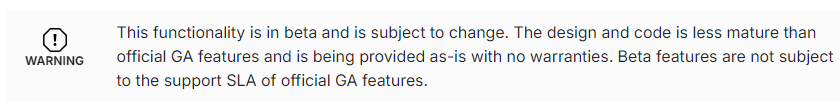 翻译 警告:此功能处于测试阶段,可能会发生变化。设计和代码不如官方GA功能成熟,并且按原样提供,没有任何保证。Beta版功能不受正式GA功能的支持SLA的限制。使用时需要注意风险