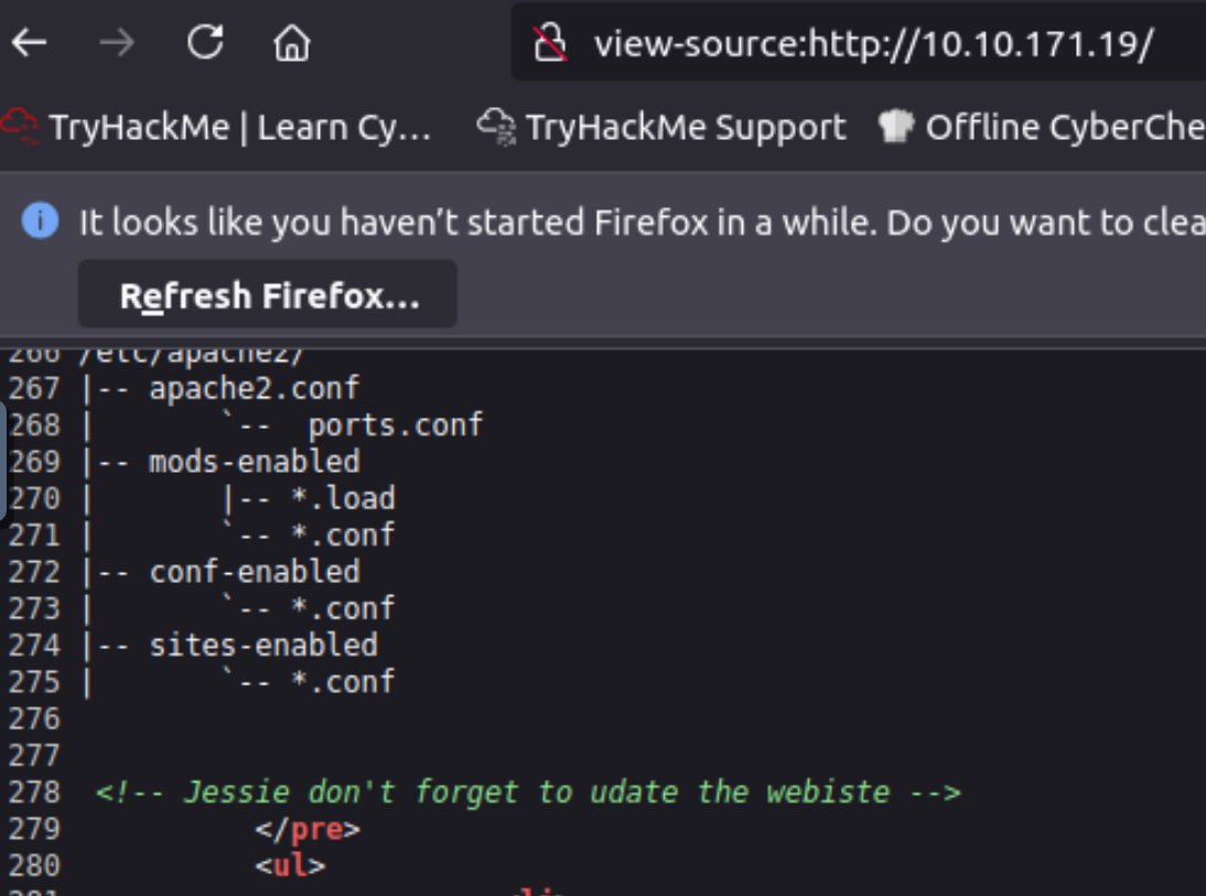 回到这道题本身,我们需要知道目标服务器的用户名,这里是在网页ctrl+u中得到的信息的