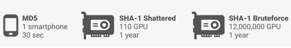 这次大新闻还给出了攻击的代价。相比MD5可以用手机秒算而言,SHA-1的代价是110个GPU一年。这个代价对于中小企业和个人还是很难接受,但是对于大公司而言是可以做到的。更别忘了摩尔定律还在垂死挣扎,拥有更加高效,更加廉价的计算资源,也是历史的行程,不能不考虑。