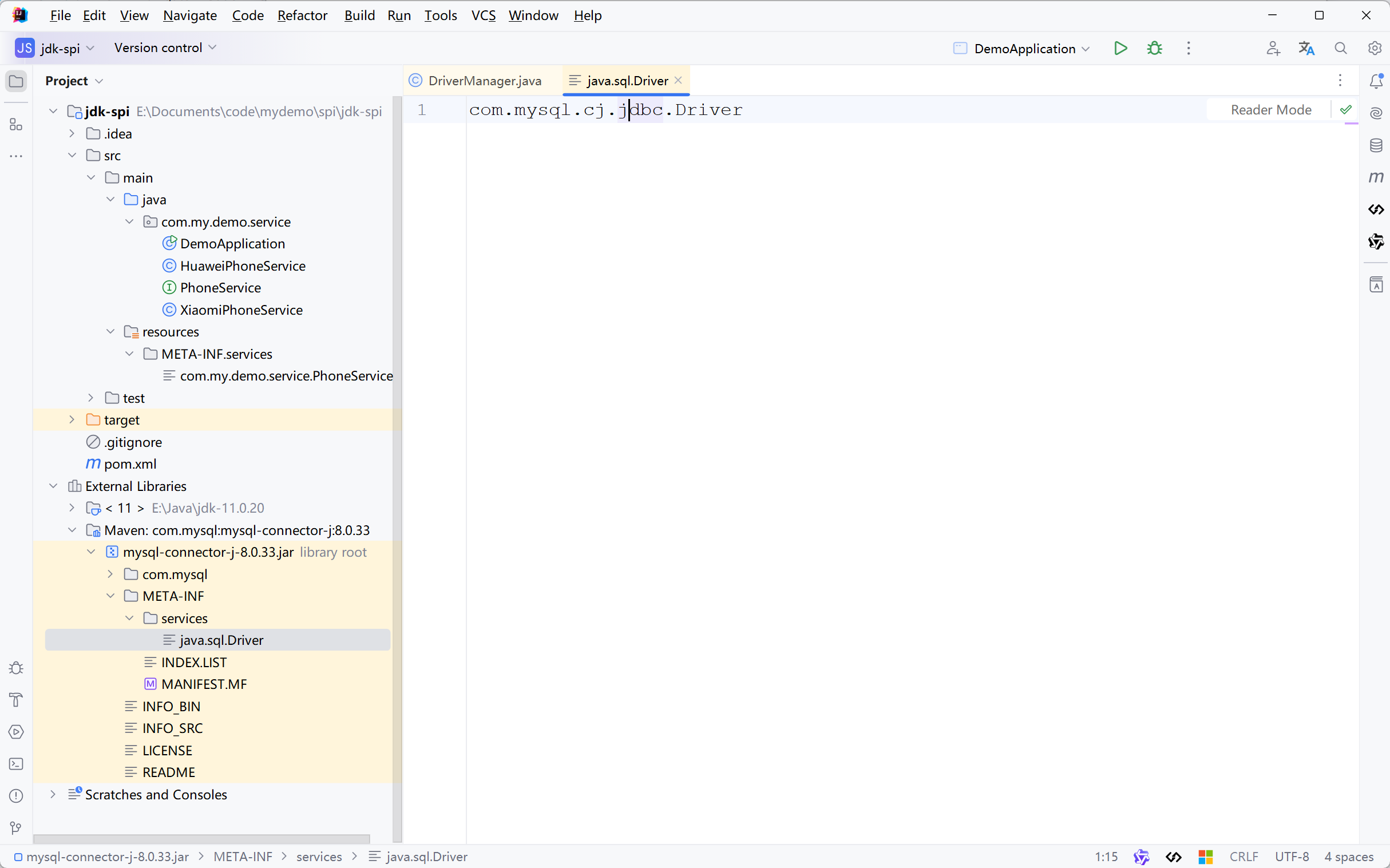 在mysql的jar包中,可以找到META-INF/services目录,该目录下会有一个名字为java.sql.Driver的文件,文件内容是com.mysql.cj.jdbc.Driver,这里面的内容就是针对Java中定义的接口的实现。