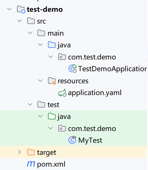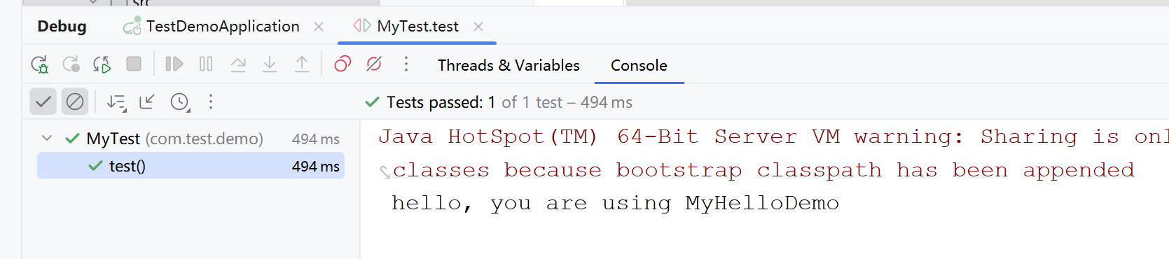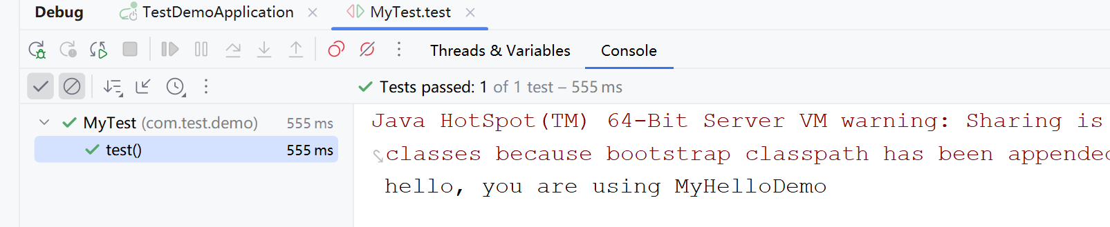 在testdemo测试模块引入mydemo依赖,新建一个测试方法:- @Test