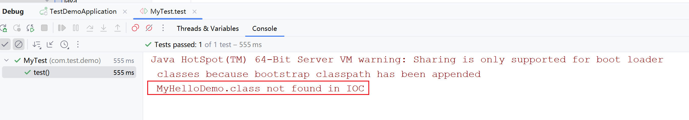 - System.err.println(" MyHelloDemo.class not found in IOC");