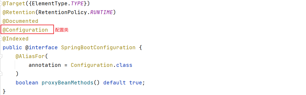 @SpringBootConfiguration注解上使用了@Configuration,表明SpringBoot启动类就是一个配置类。