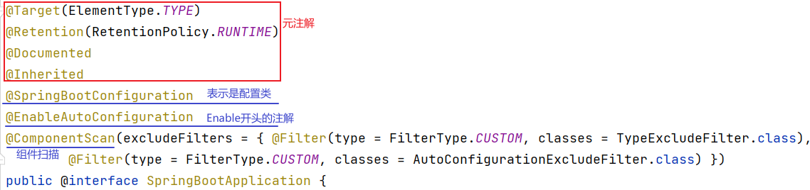 自动配置原理源码入口就是@SpringBootApplication注解,在这个注解中封装了3个注解,分别是: